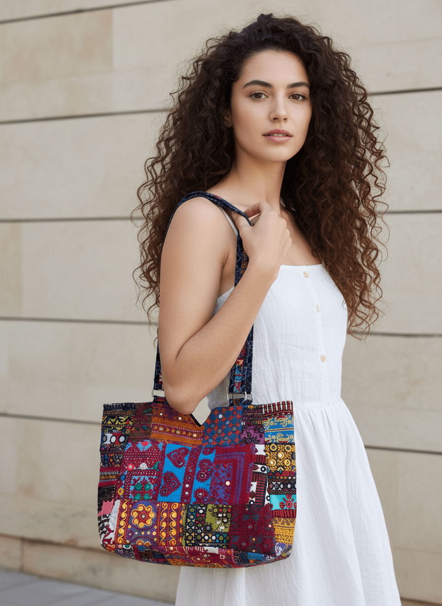 Hand-stitched by skilled artisans, this medium-sized handbag showcases rich patchwork patterns, vibrant textures, and expressive colors.