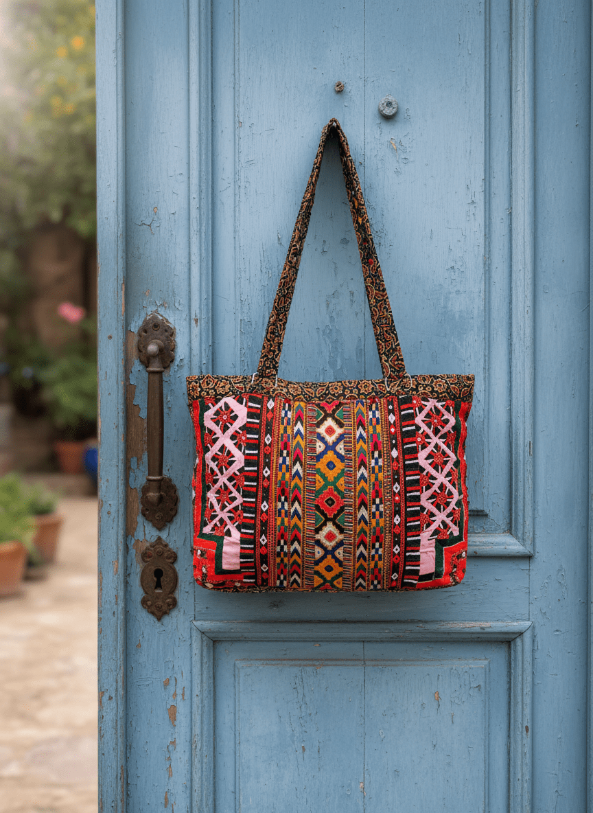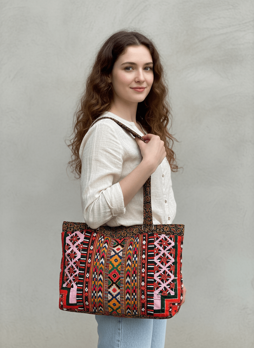 Made entirely by hand, this larger bag combines vibrant patchwork, textured fabrics, and traditional stitching techniques passed down through 1700+ years of Sindhi craftsmanship.