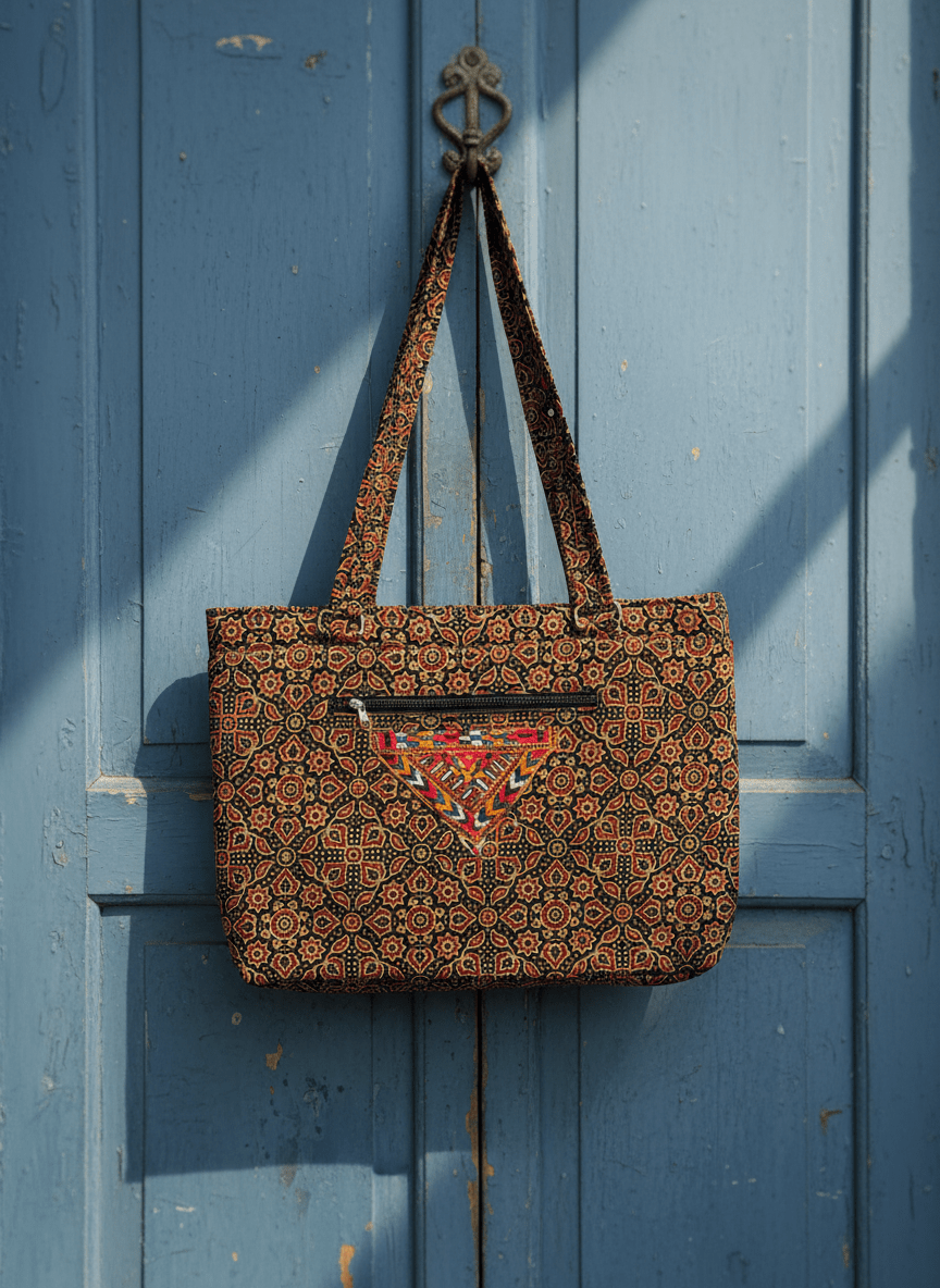 The patches in this bag are over 100 years old, lovingly created by the women of Thar–Mithi. Each piece tells a story — of celebrations, prayers, and quiet daily life — stitched with patience, love, and cultural pride.