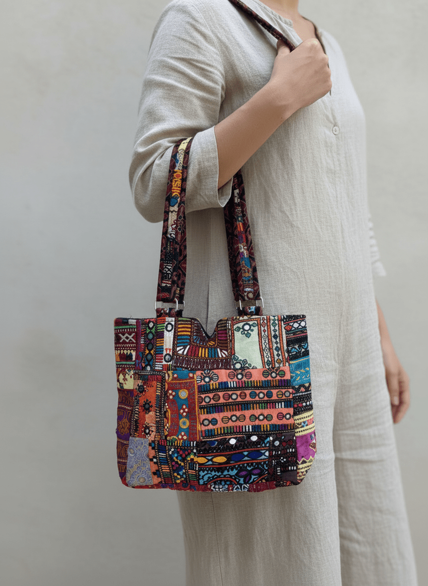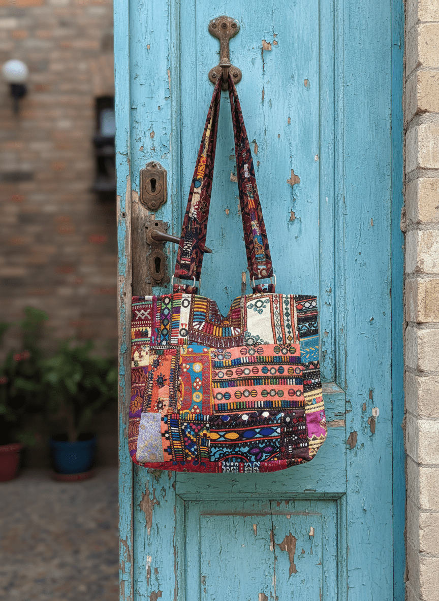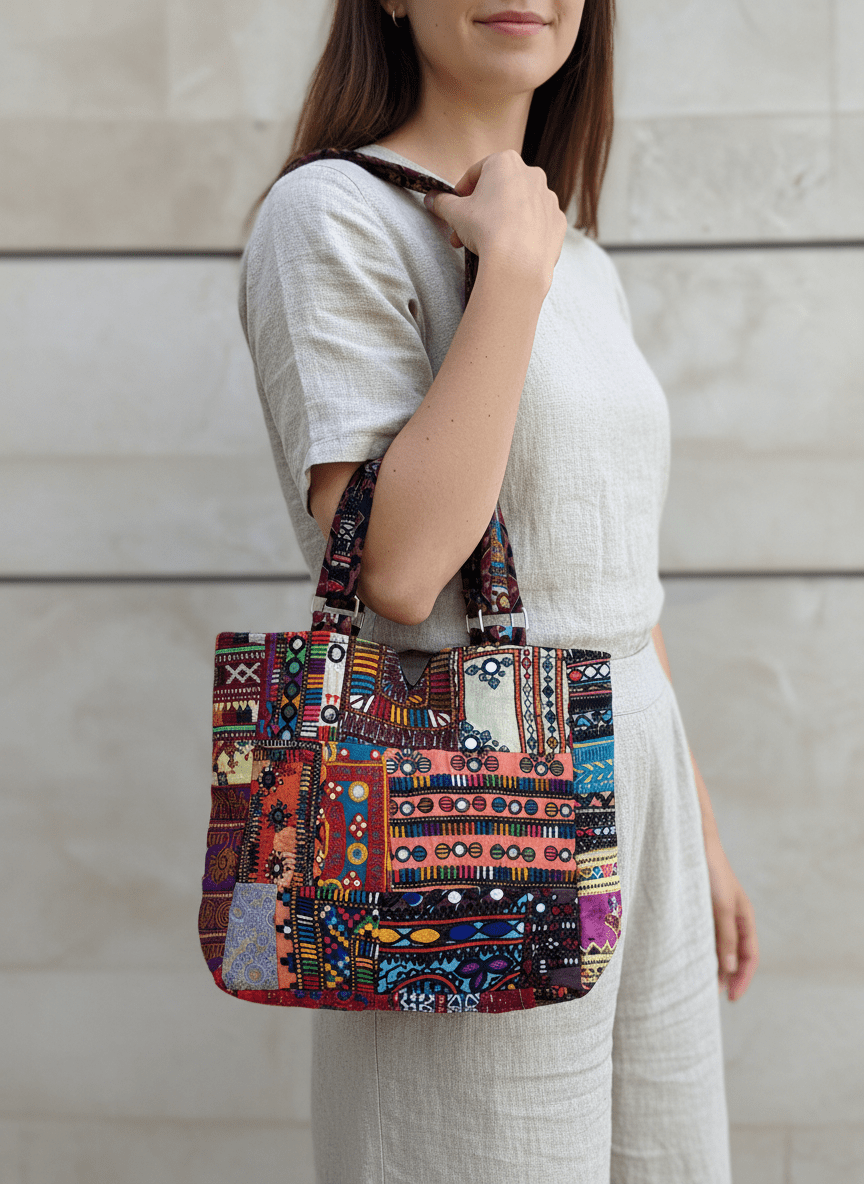 Each bag is carefully made by skilled artisans who combine assorted fabric patches, textured patterns, and expressive colors to create a handbag that feels artistic and timeless.